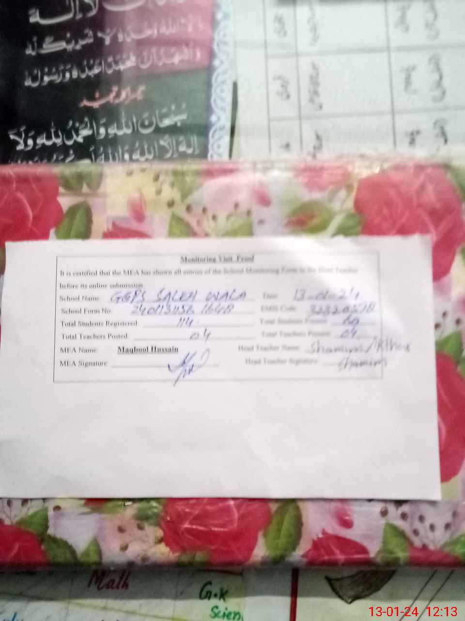 | Attendance Register | Head Teacher | MEA with School | Visit Proof |