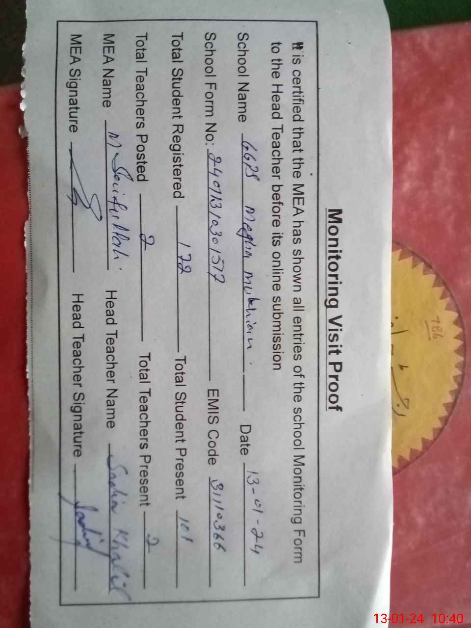 | Attendance Register | Head Teacher | MEA with School | Visit Proof |
