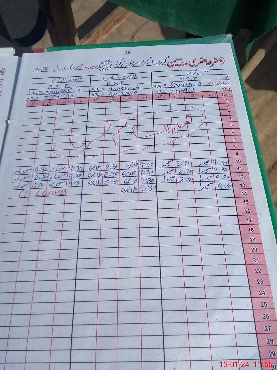 | CNIC | Full Name | Designation | R/C | Absence During Last Calender Month |