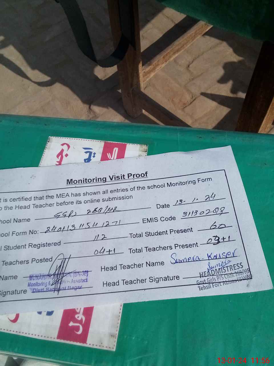 | Attendance Register | Head Teacher | MEA with School | Visit Proof |