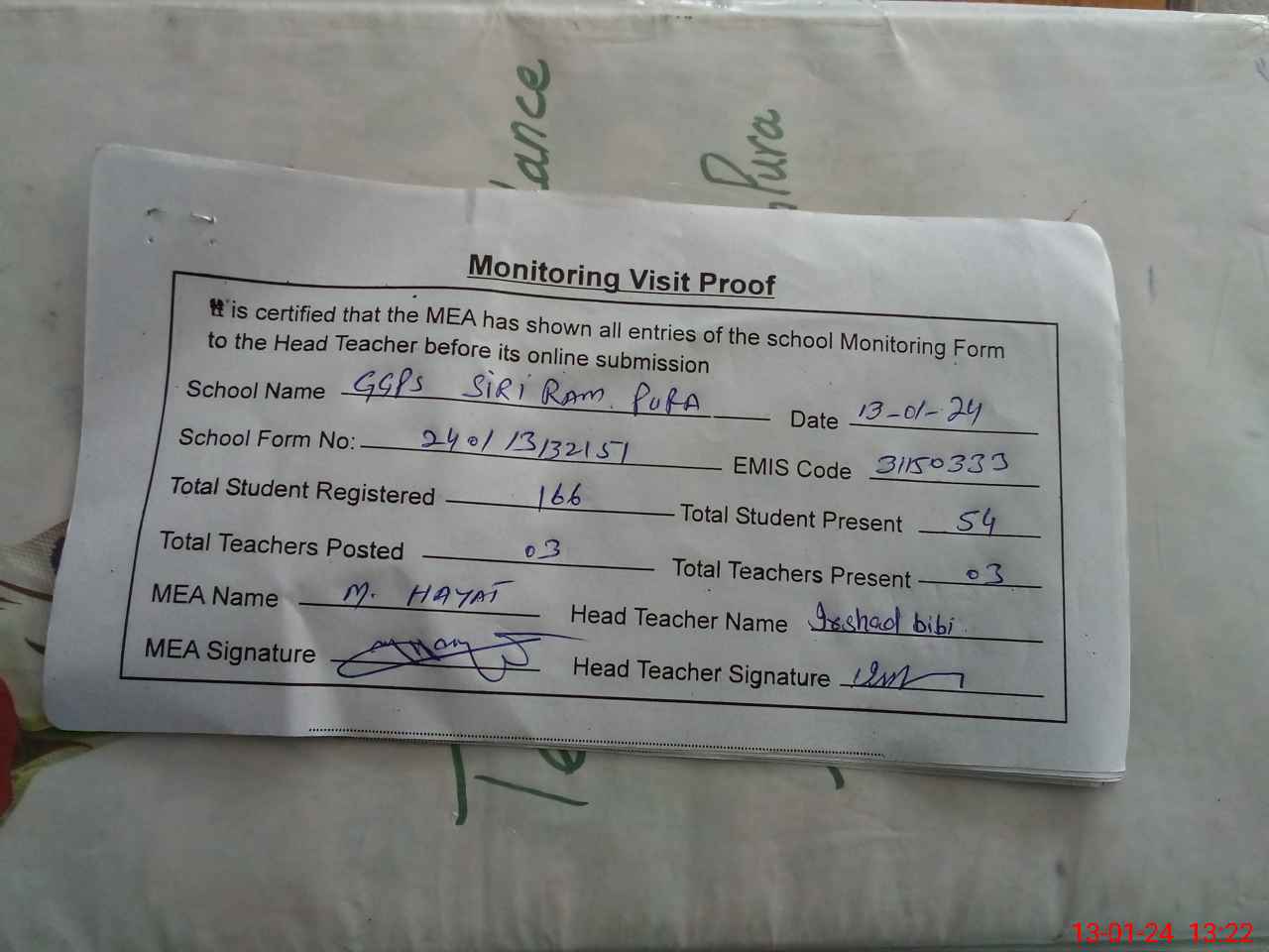 | Attendance Register | Head Teacher | MEA with School | Visit Proof |