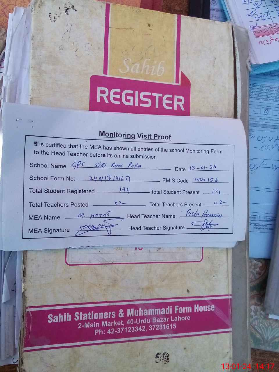 | Attendance Register | Head Teacher | MEA with School | Visit Proof |