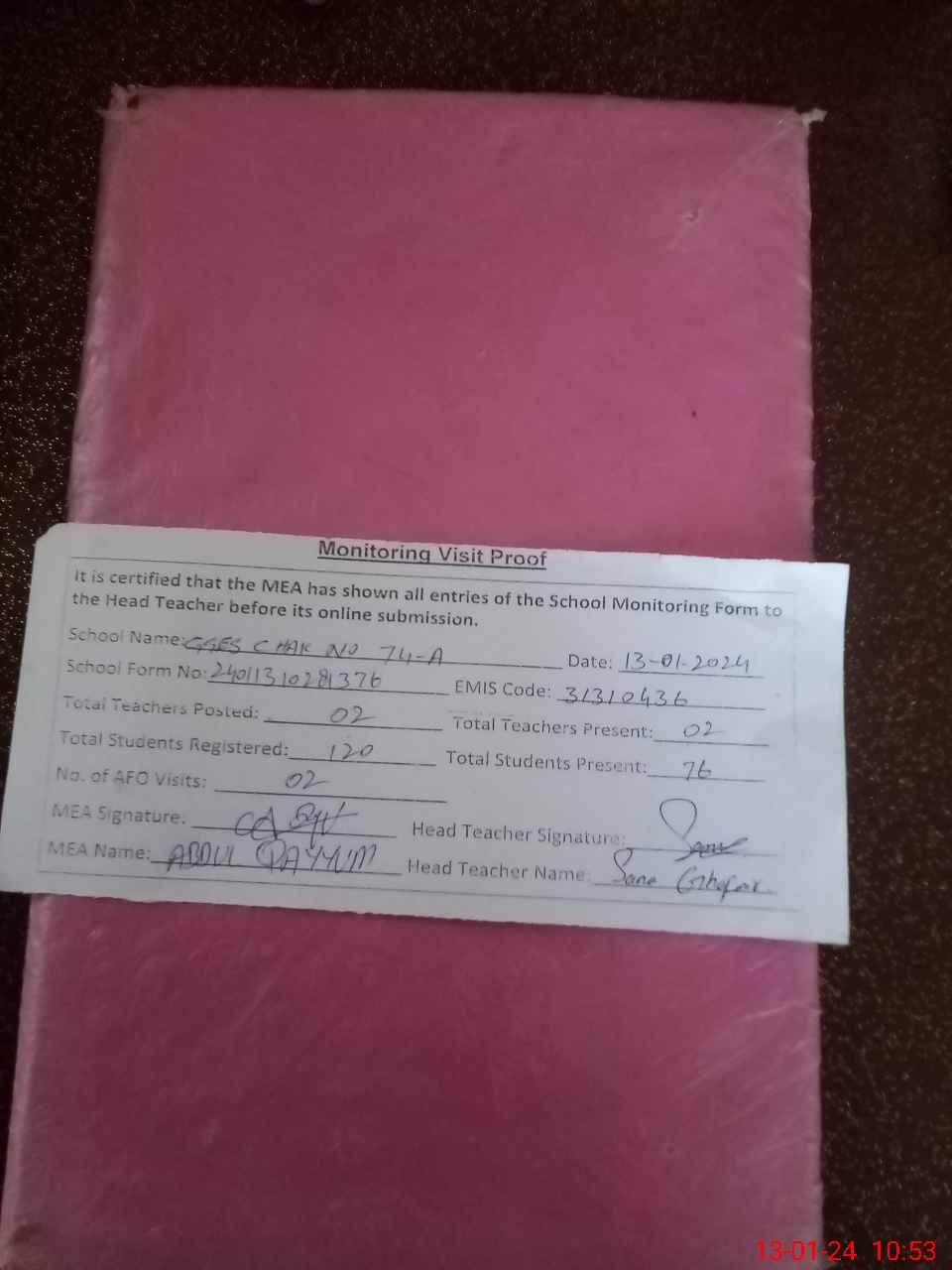 | EMIS Code: 31310436 | Name of School: GGES CHAK NO 74/A | |||