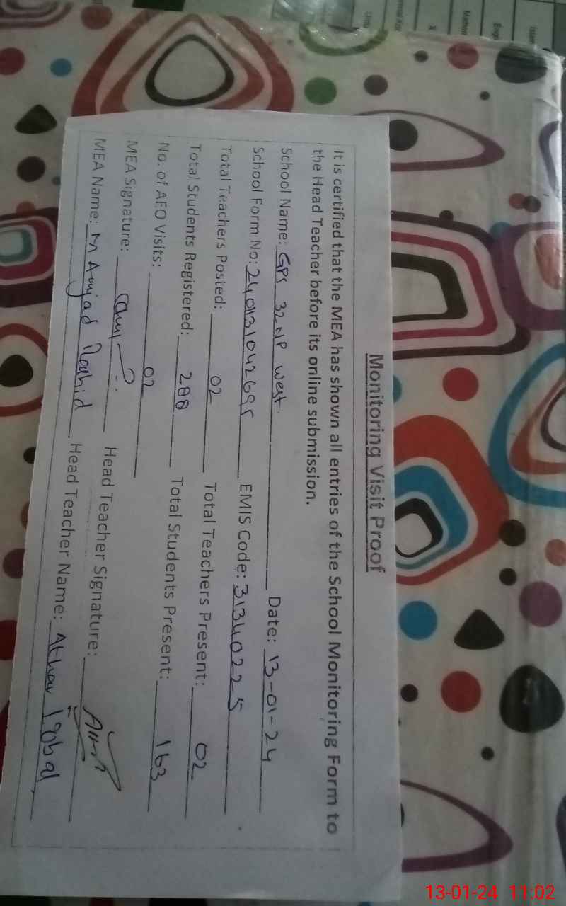| EMIS Code: 31340225 | Name of School: GPS CHAK NO. 32 WEST | |||