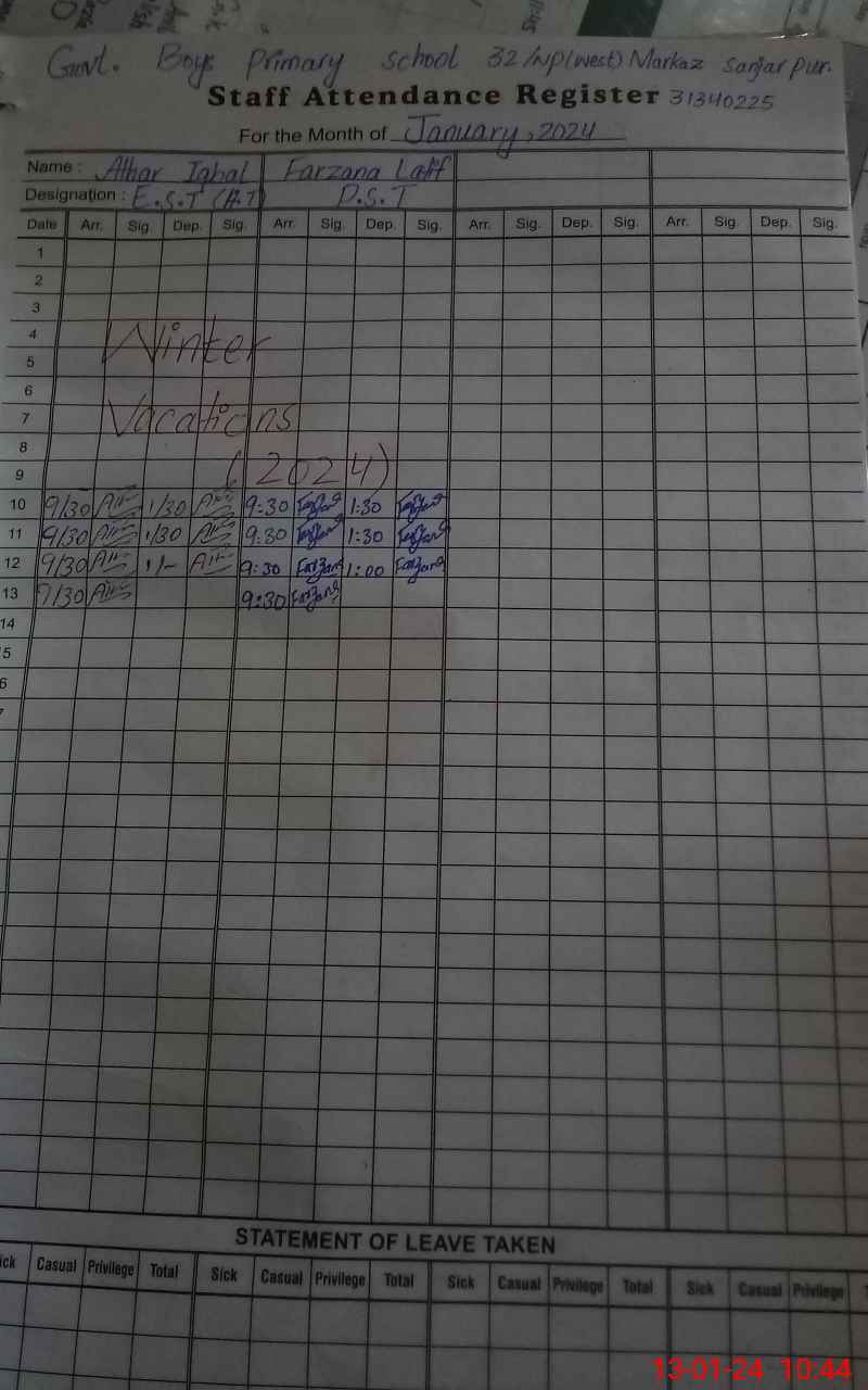 | CNIC | Full Name | Designation | R/C | Absence During Last Calender Month |