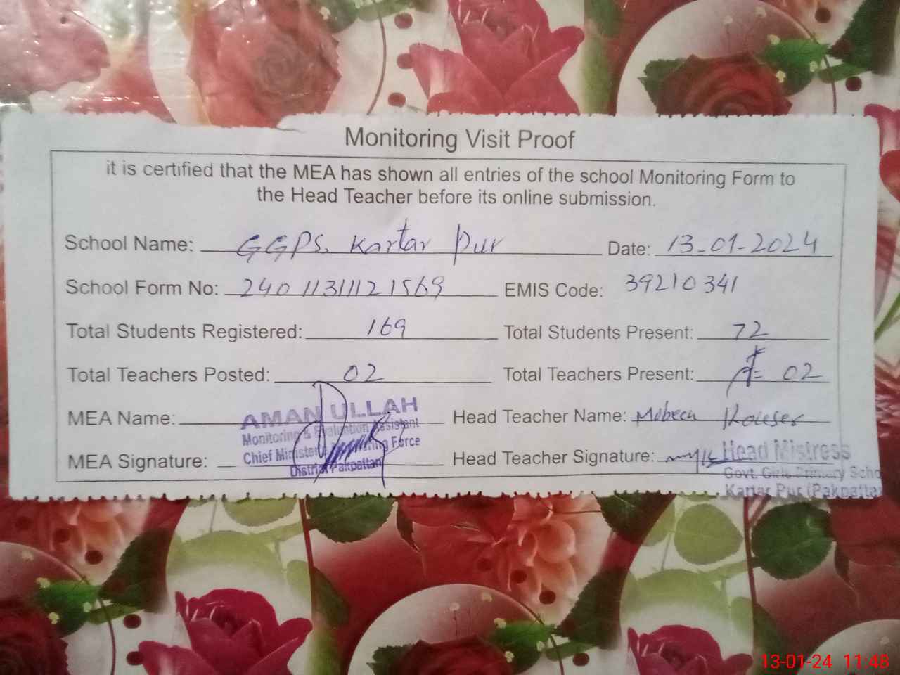| Attendance Register | Head Teacher | MEA with School | Visit Proof |
