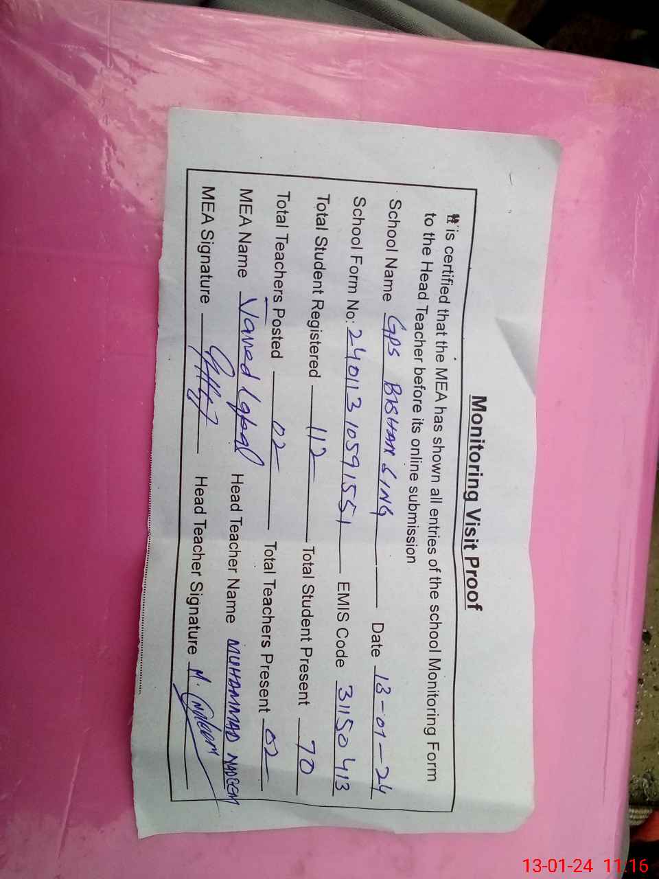 | Attendance Register | Head Teacher | MEA with School | Visit Proof |
