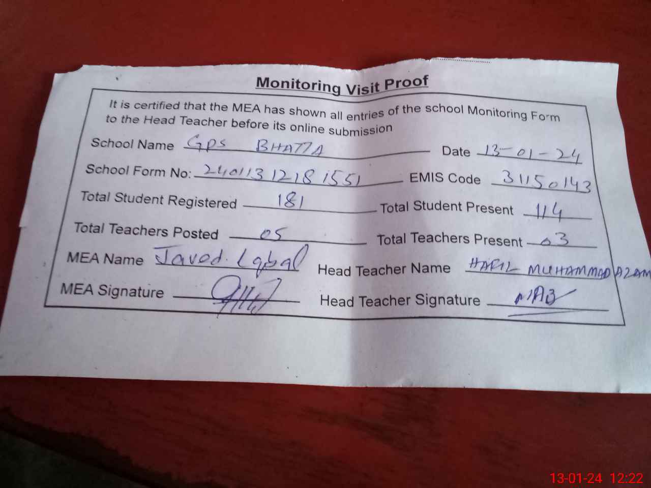| EMIS Code: 31150143 | Name of School: GPS BHATTA | |||