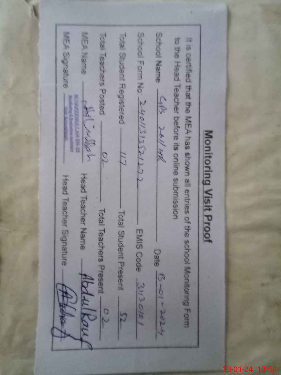 | Attendance Register | Head Teacher | MEA with School | Visit Proof |