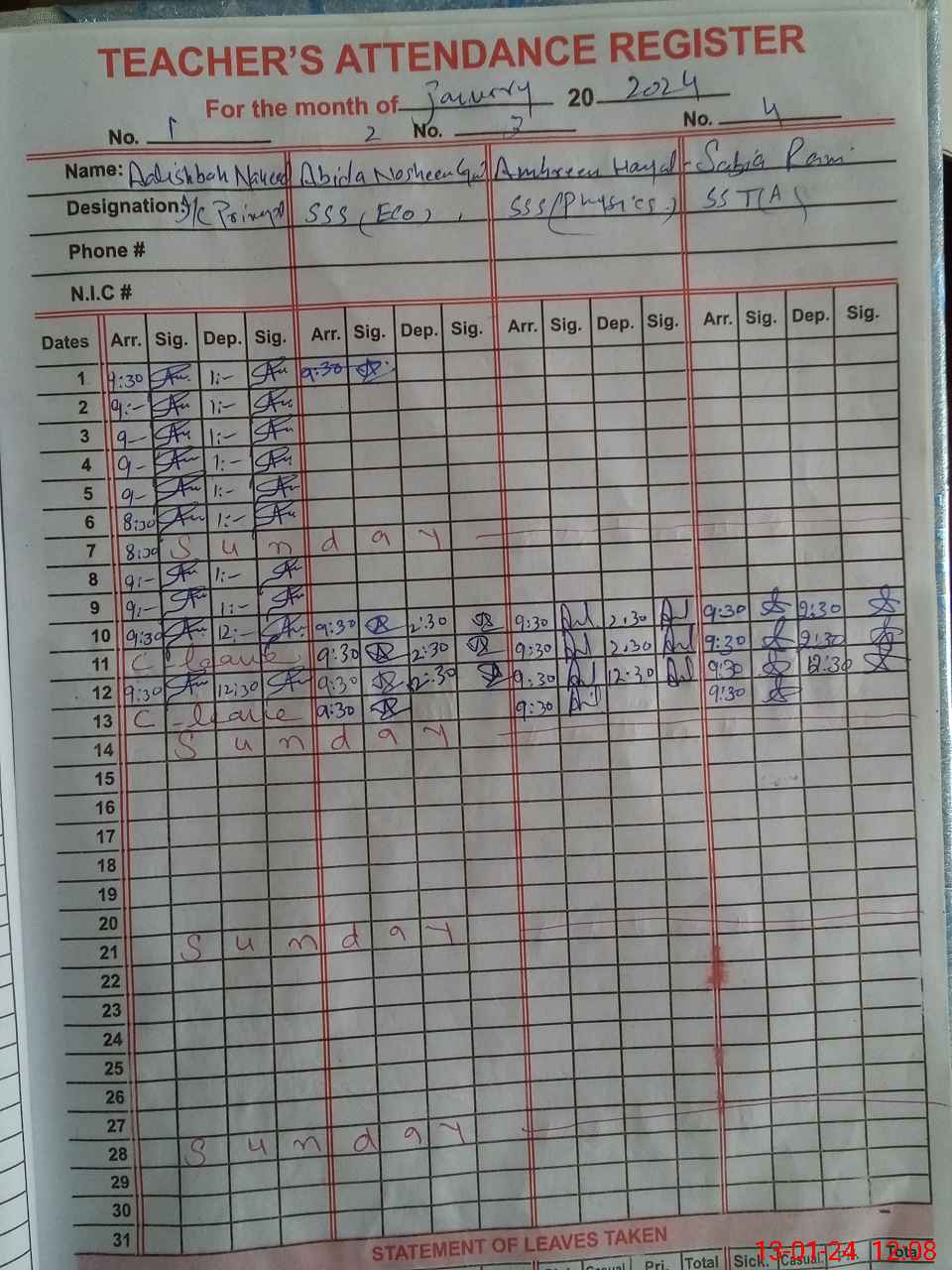 | CNIC | Full Name | Designation | R/C | Absence During Last Calender Month |