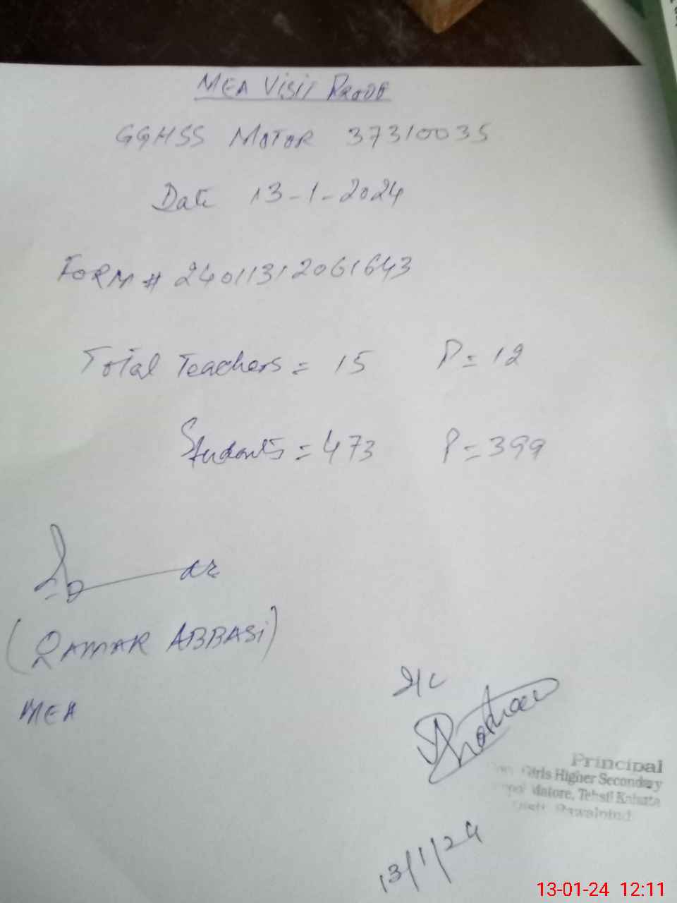 | Attendance Register | Head Teacher | MEA with School | Visit Proof |