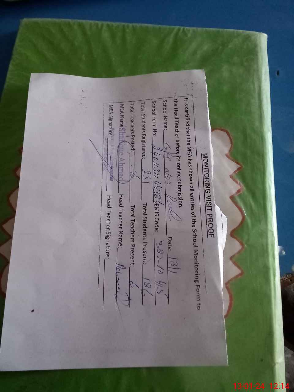 | Attendance Register | Head Teacher | MEA with School | Visit Proof |