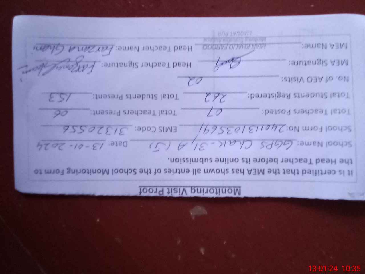 | Attendance Register | Head Teacher | MEA with School | Visit Proof |