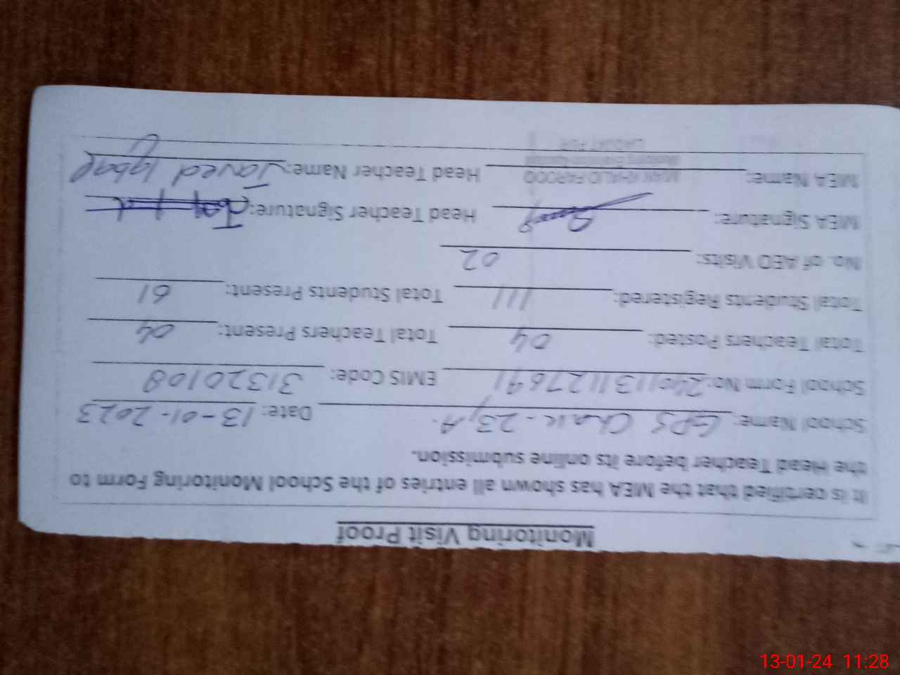 | Attendance Register | Head Teacher | MEA with School | Visit Proof |