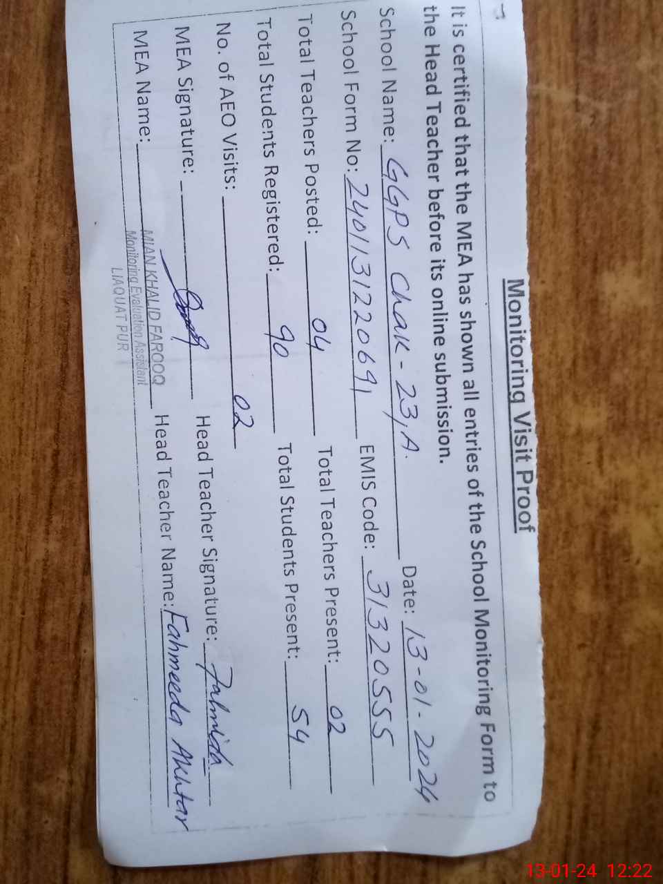 | EMIS Code: 31320555 | Name of School: GGPS CHAK NO 23/A | |||