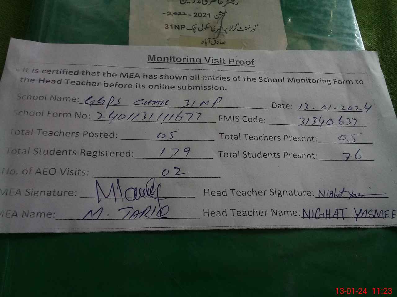 | Attendance Register | Head Teacher | MEA with School | Visit Proof |