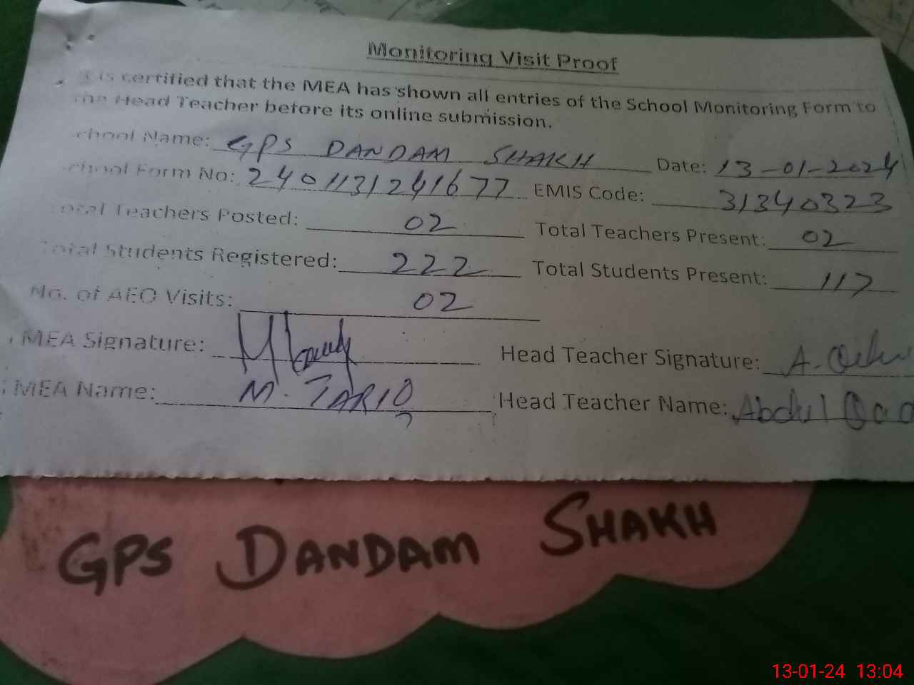 | Attendance Register | Head Teacher | MEA with School | Visit Proof |