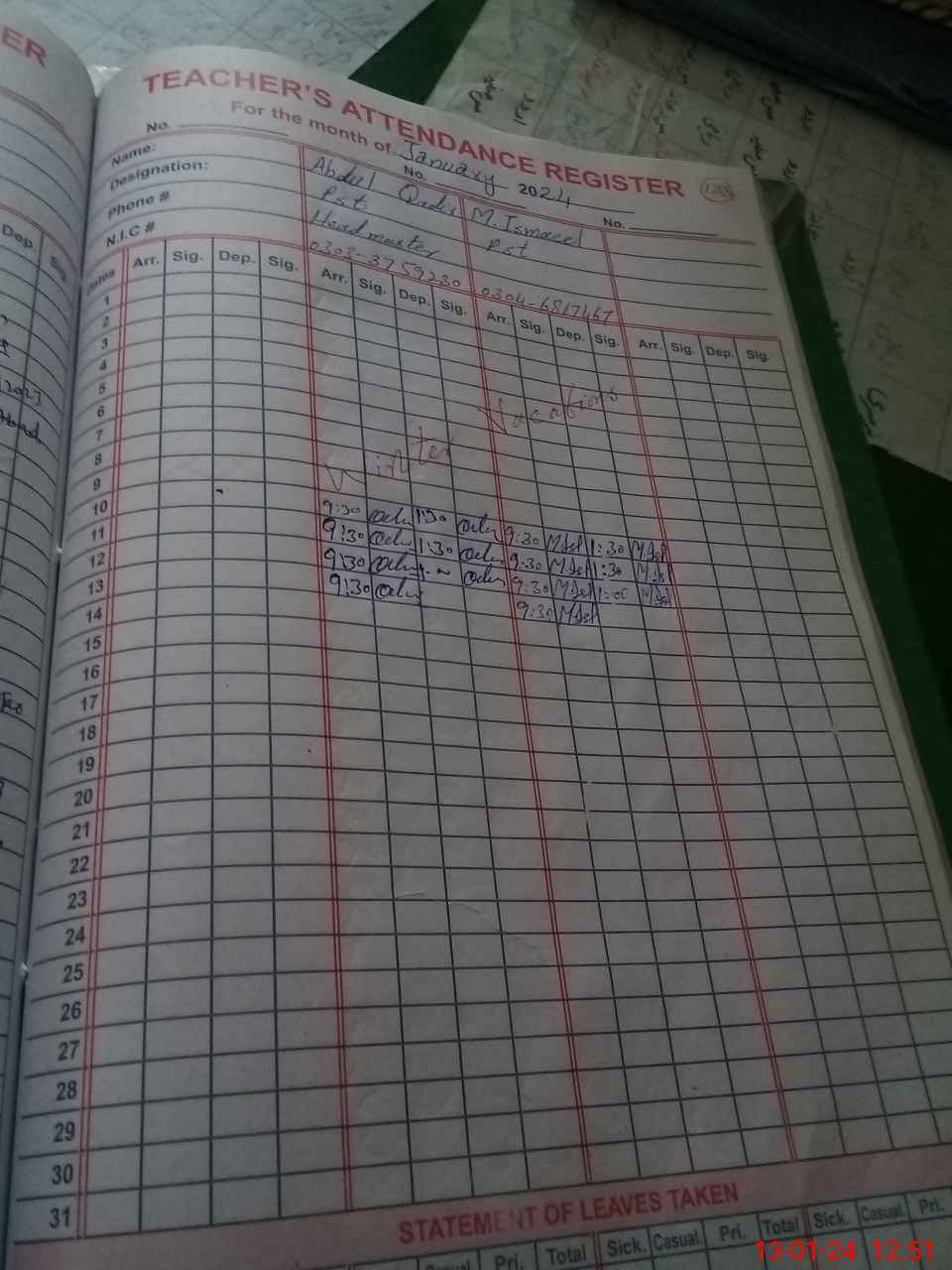 | Name: Ab**** Qa**** Designation: (School Headmaster's/Headmistress's) PST Phone/Cell Number: 03**** |