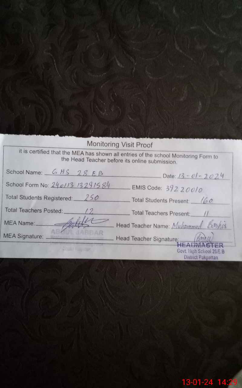 | EMIS Code: 39220010 | Name of School: GHS 28 EB TEH ARIF WALA | |||