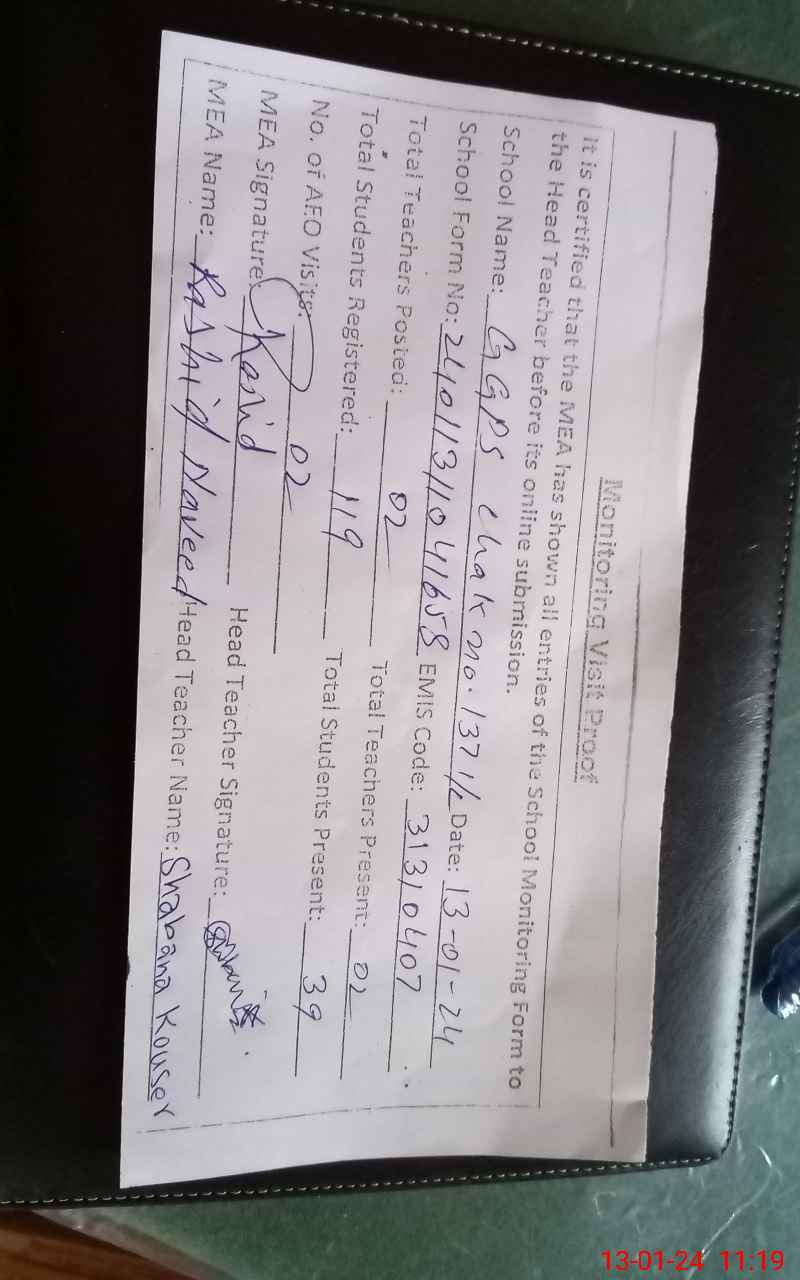 | Attendance Register | Head Teacher | MEA with School | Visit Proof |