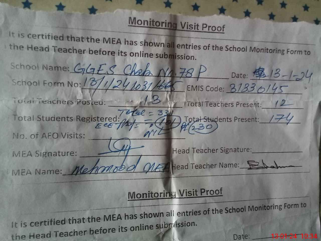 | Attendance Register | Head Teacher | MEA with School | Visit Proof |