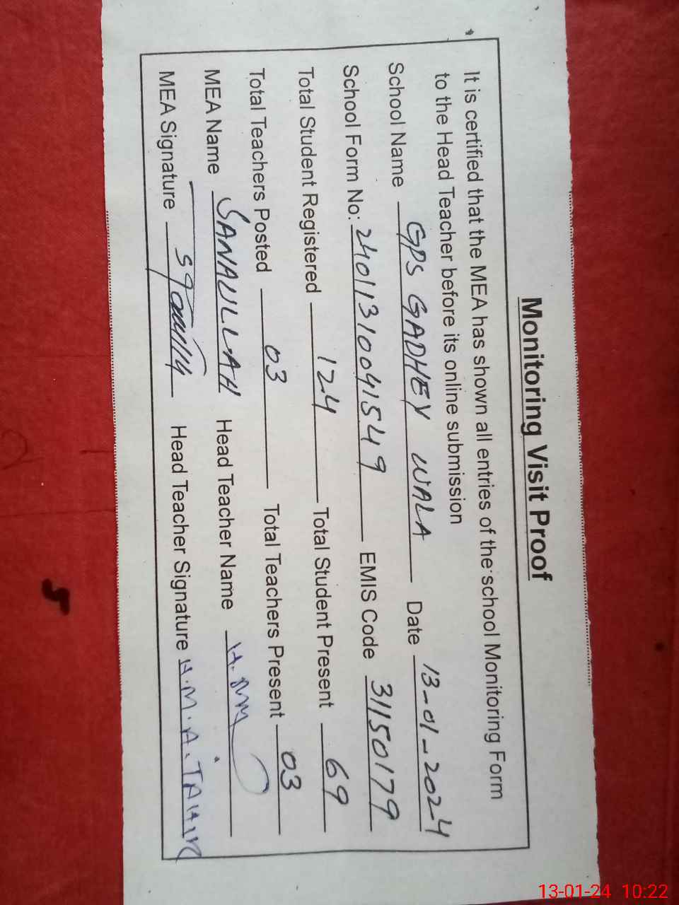 | Attendance Register | Head Teacher | MEA with School | Visit Proof |