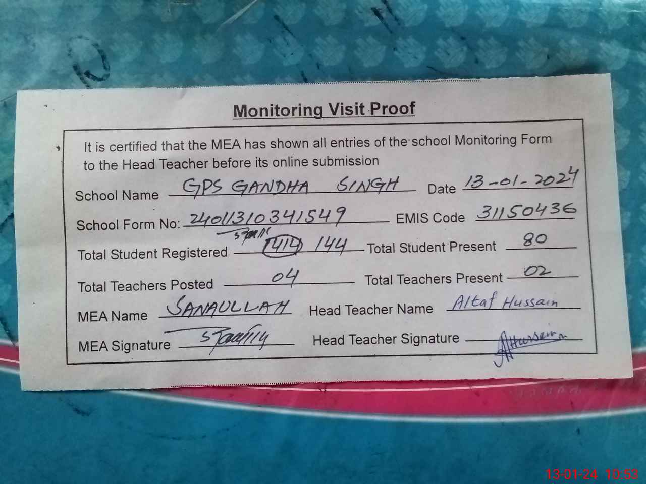 | Attendance Register | Head Teacher | MEA with School | Visit Proof |