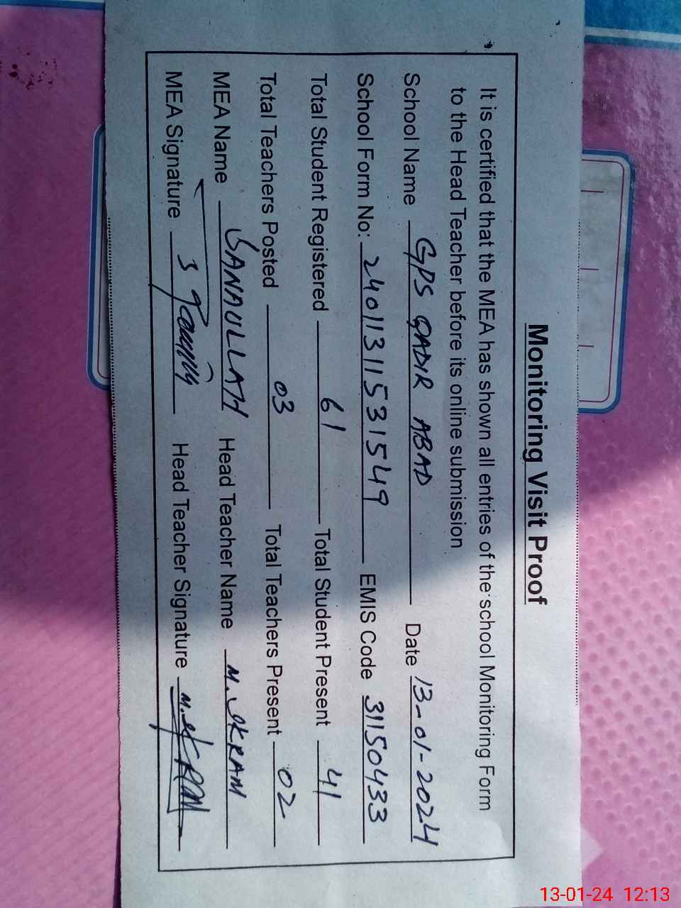 | Attendance Register | Head Teacher | MEA with School | Visit Proof |