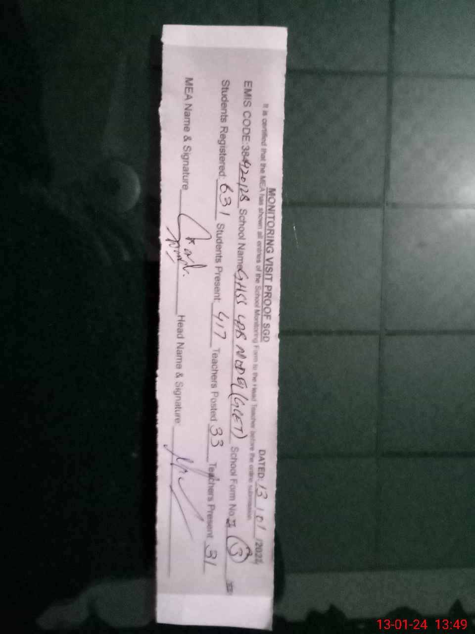 | Attendance Register | Head Teacher | MEA with School | Visit Proof |