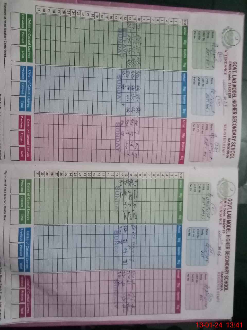 | CNIC | Full Name | Designation | R/C | Absence During Last Calender Month |