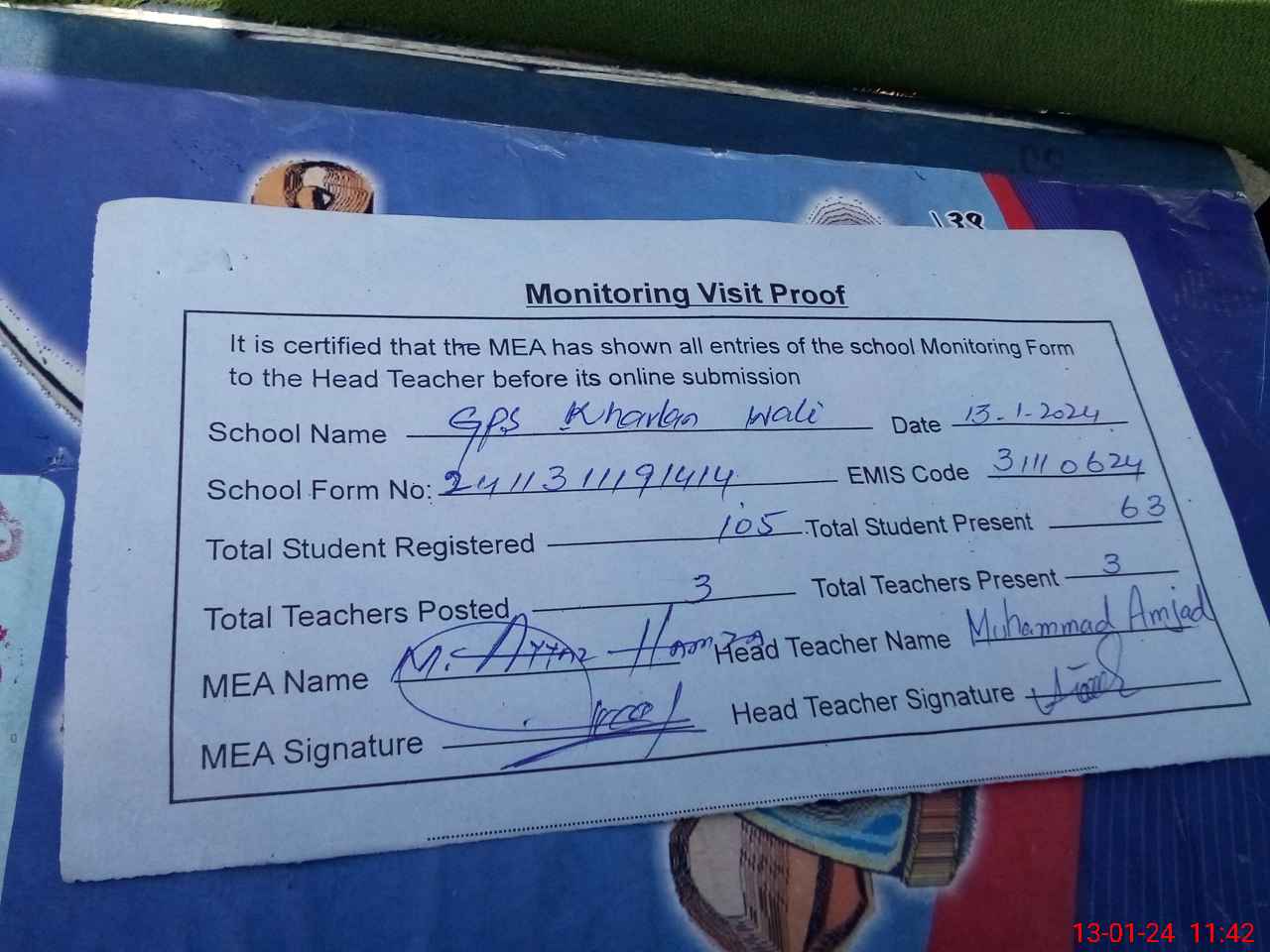| Attendance Register | Head Teacher | MEA with School | Visit Proof |
