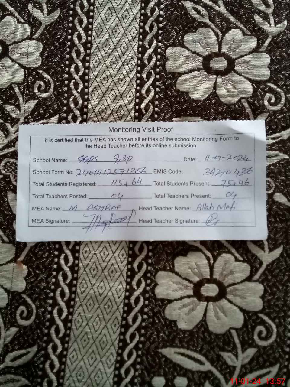 | Attendance Register | Head Teacher | MEA with School | Visit Proof |