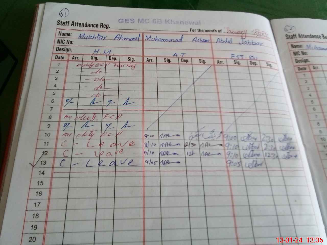 | CNIC | Full Name | Designation | R/C | Absence During Last Calender Month |