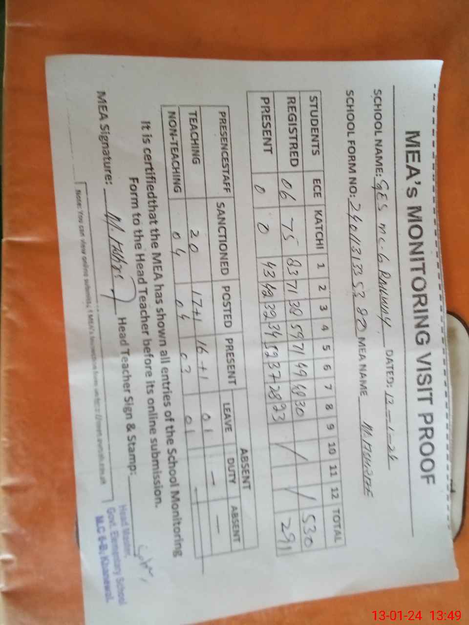 | Attendance Register | Head Teacher | MEA with School | Visit Proof |