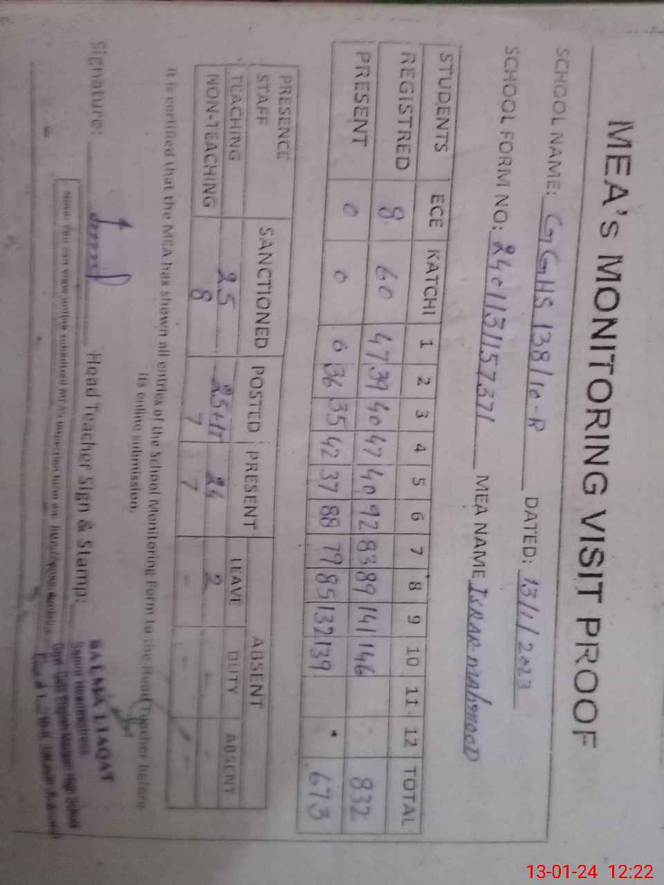 | Attendance Register | Head Teacher | MEA with School | Visit Proof |