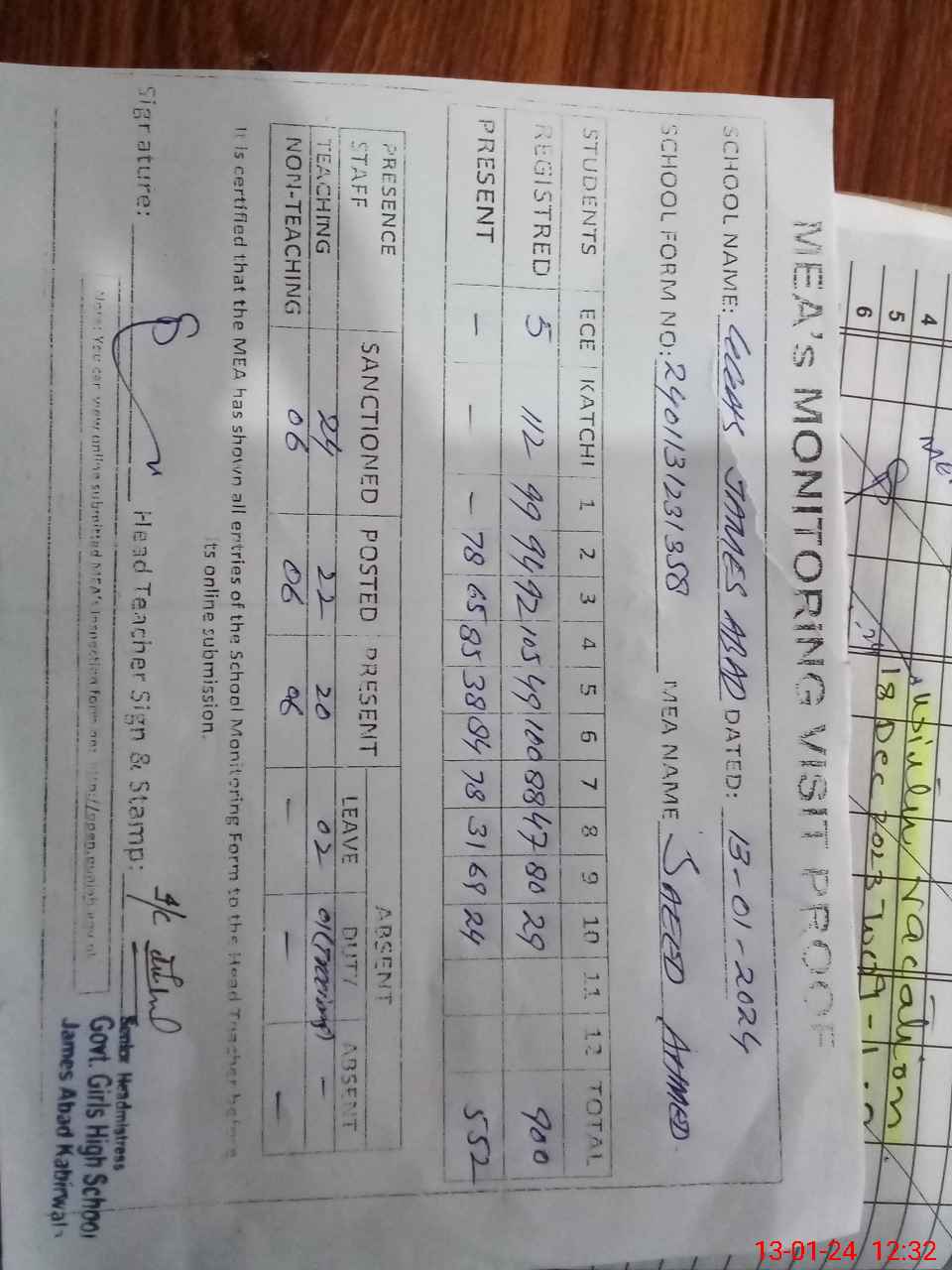 | EMIS Code: 36410096 | Name of School: GGHS JAMES ABAD, KABIRWALA | |||
