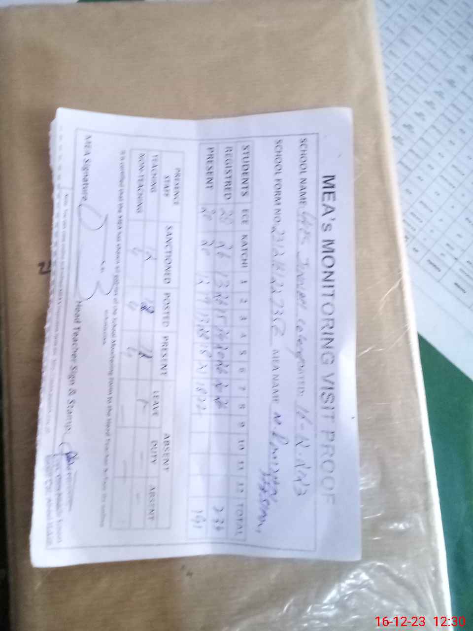 | Attendance Register | Head Teacher | MEA with School | Visit Proof |