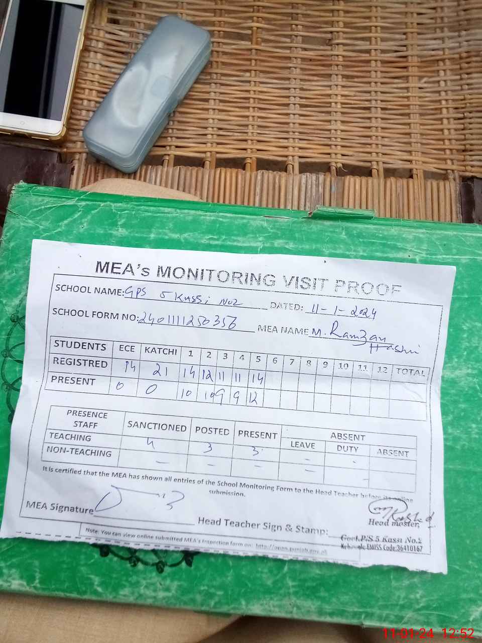 | Attendance Register | Head Teacher | MEA with School | Visit Proof |