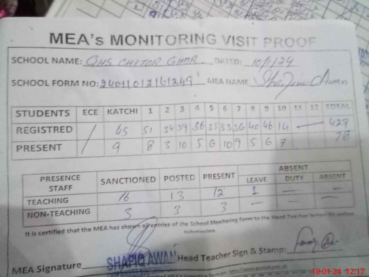 | Attendance Register | Head Teacher | MEA with School | Visit Proof |