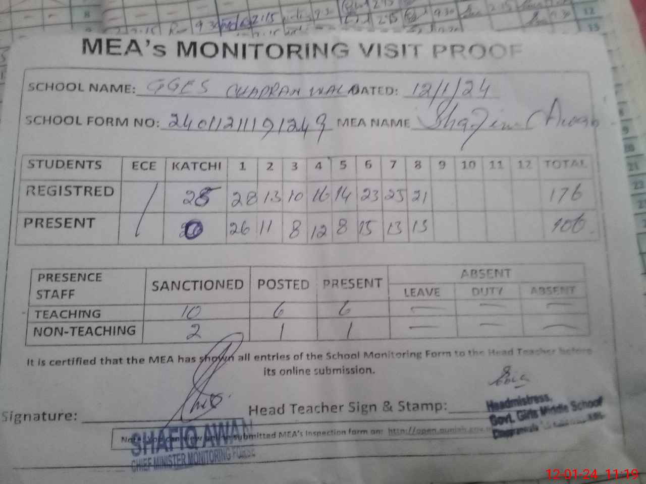 | Attendance Register | Head Teacher | MEA with School | Visit Proof |