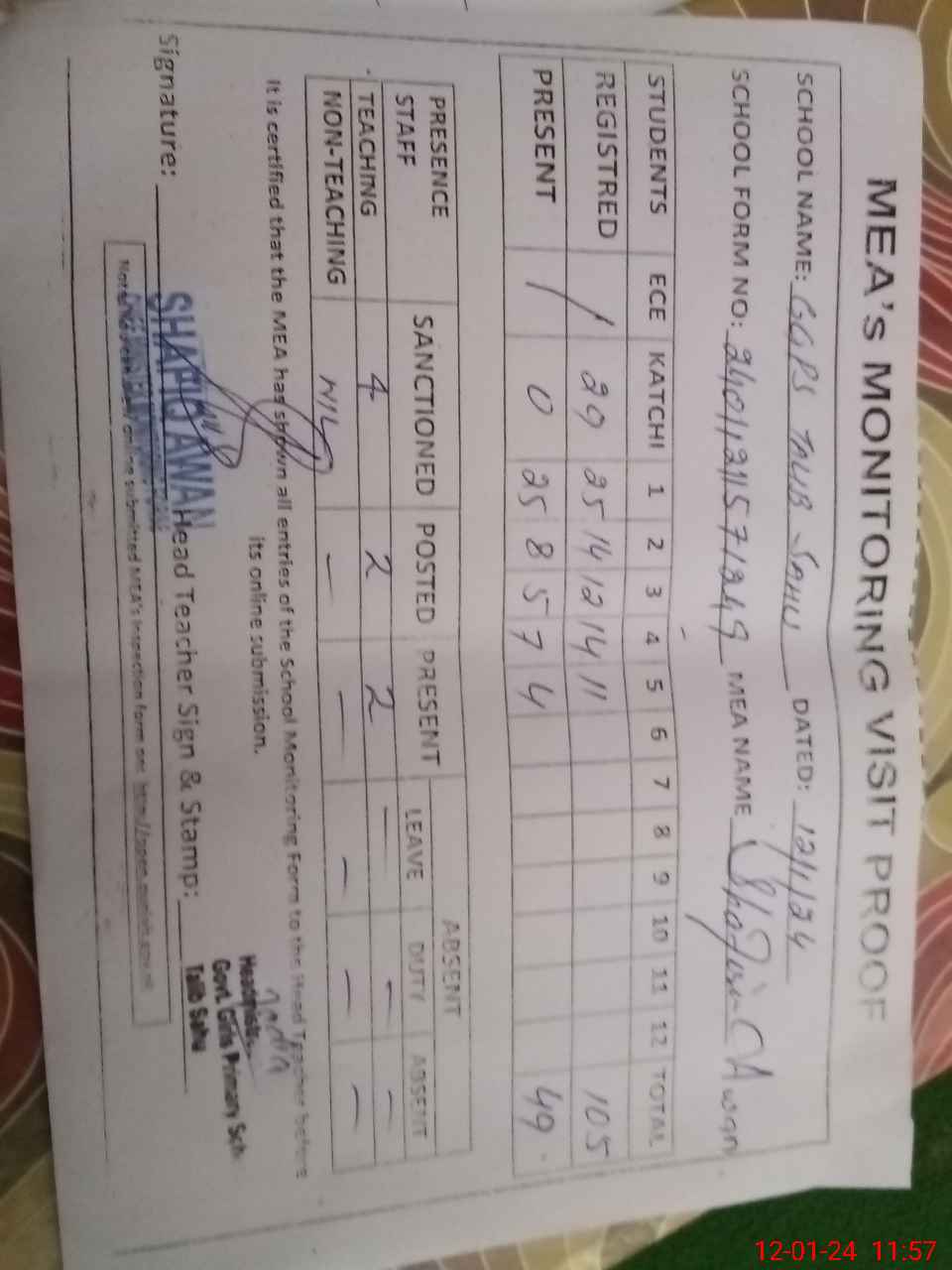 | Attendance Register | Head Teacher | MEA with School | Visit Proof |