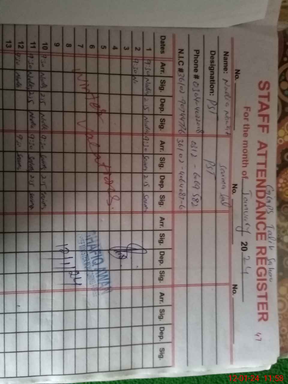 | CNIC | Full Name | Designation | R/C | Absence during last cal. month |