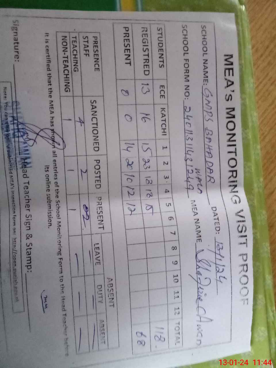 | Attendance Register | Head Teacher | MEA with School | Visit Proof |