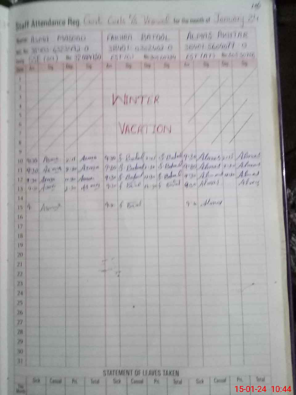 | Leave | Duty | Absent | Maternity | Medical | Ex- Pak |