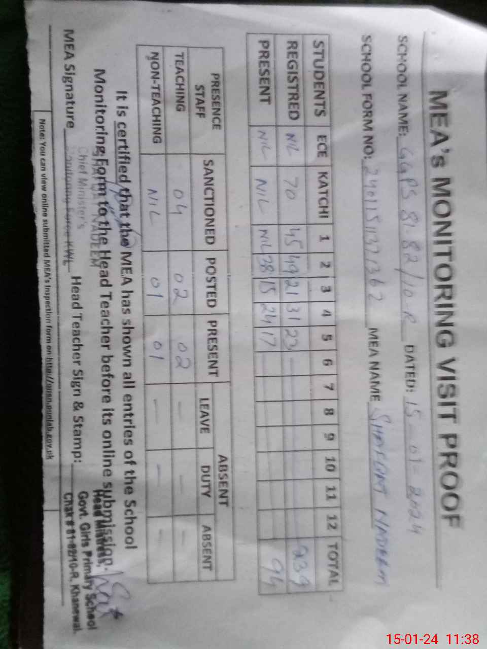| Attendance Register | Head Teacher | MEA with School | Visit Proof |