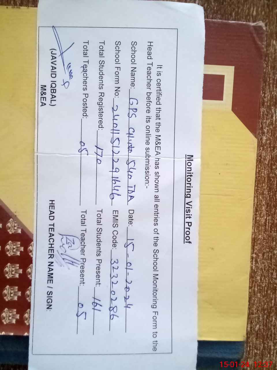 | Attendance Register | Head Teacher | MEA with School | Visit Proof |