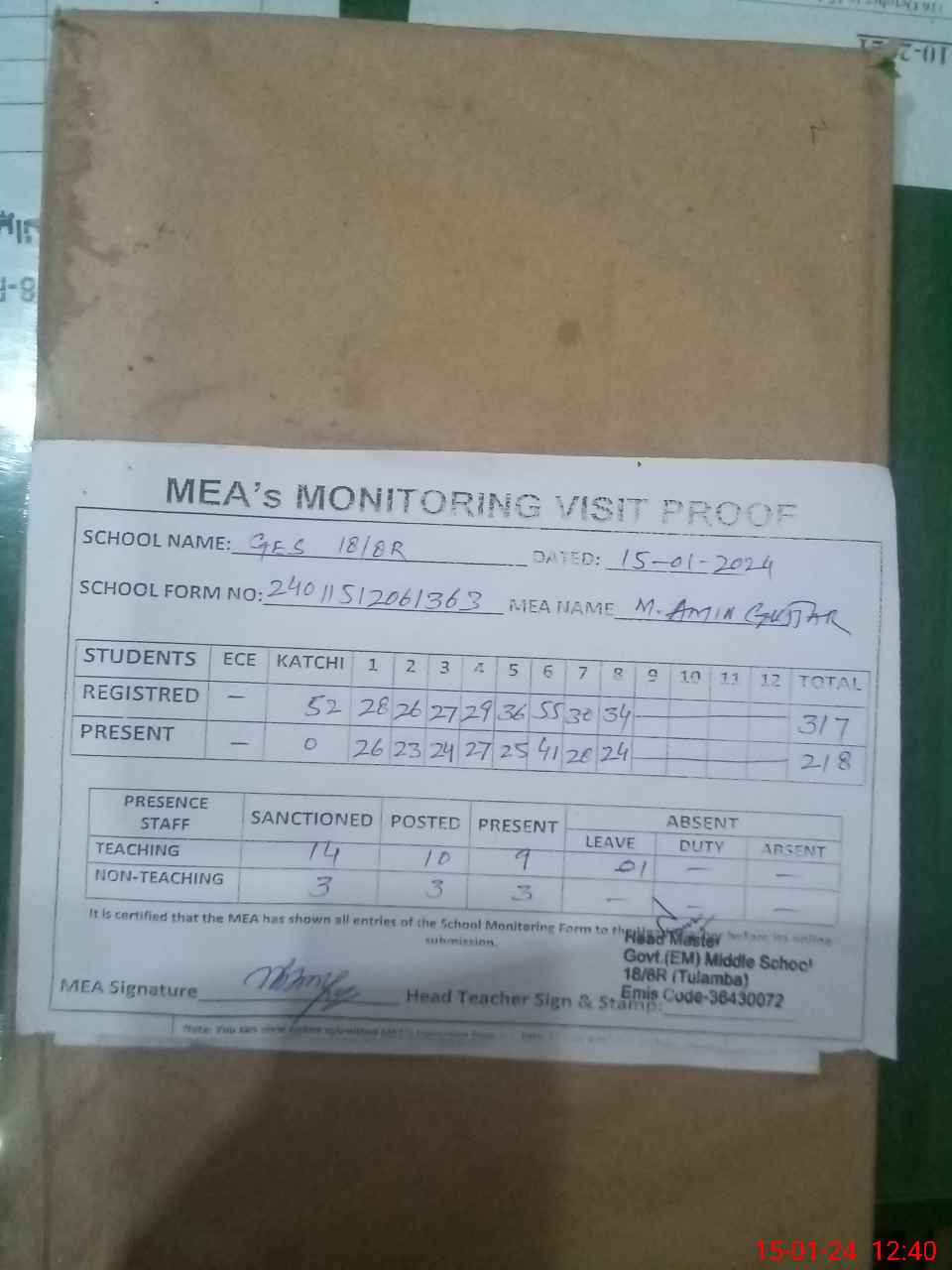 | Attendance Register | Head Teacher | MEA with School | Visit Proof |