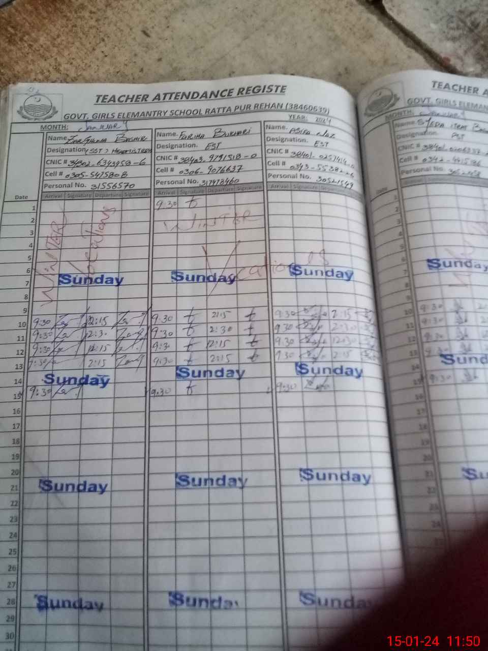 | CNIC | Full Name | Designation | R/C | Absence during last cal. month |