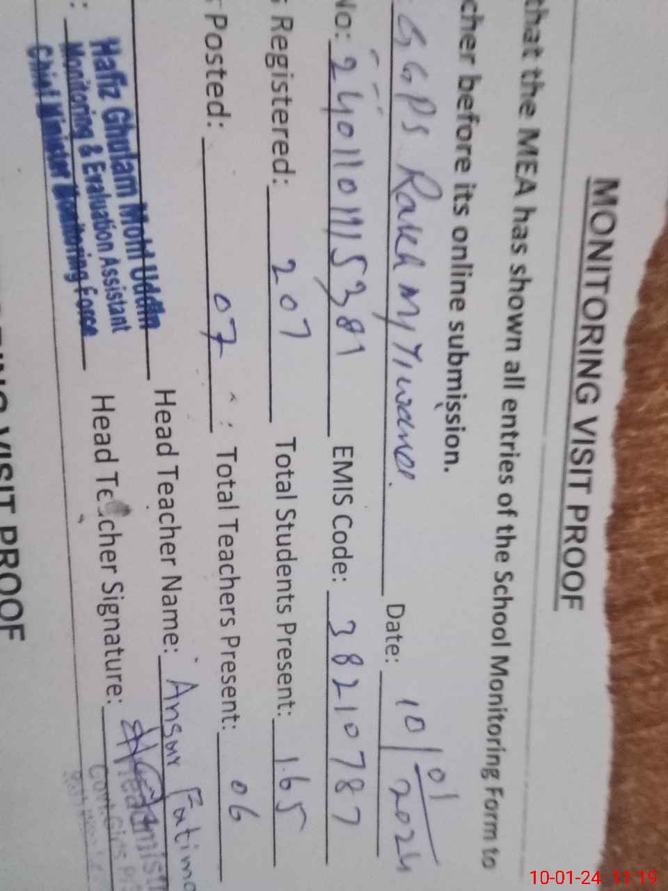 | Attendance Register | Head Teacher | MEA with School | Visit Proof |