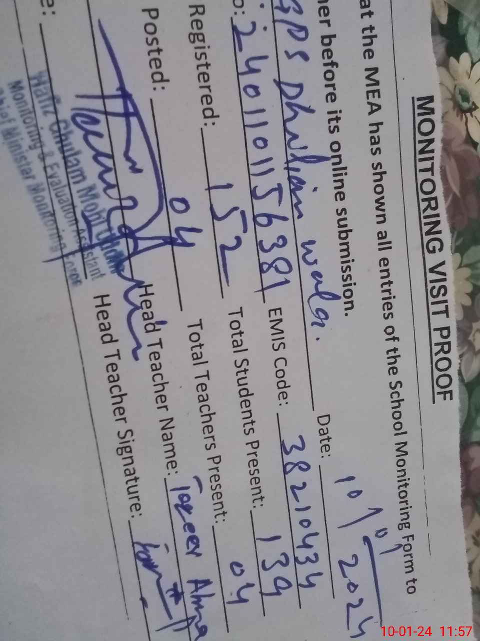 | Attendance Register | Head Teacher | MEA with School | Visit Proof |
